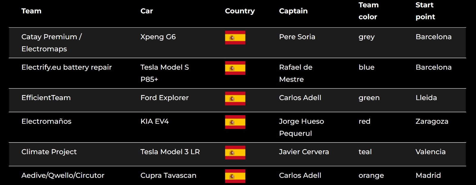 El evento, organizado con un gran espíritu de comunidad y colaboración, proponía una misma ruta para todos los participantes, con salidas simultáneas desde diferentes puntos de España —Terrassa, Lleida, Zaragoza, Madrid y Valencia— y un único reto: completar el recorrido en menos de 24 horas, respetando los límites de velocidad y gestionando de forma inteligente las paradas de carga.